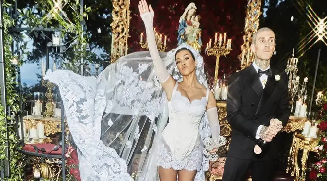 SelengkapnyaKembali Rayakan Pernikahan, Kourtney Kardashian Kenakan Gaun Korset dan Tudung Bergambar Bunda Maria